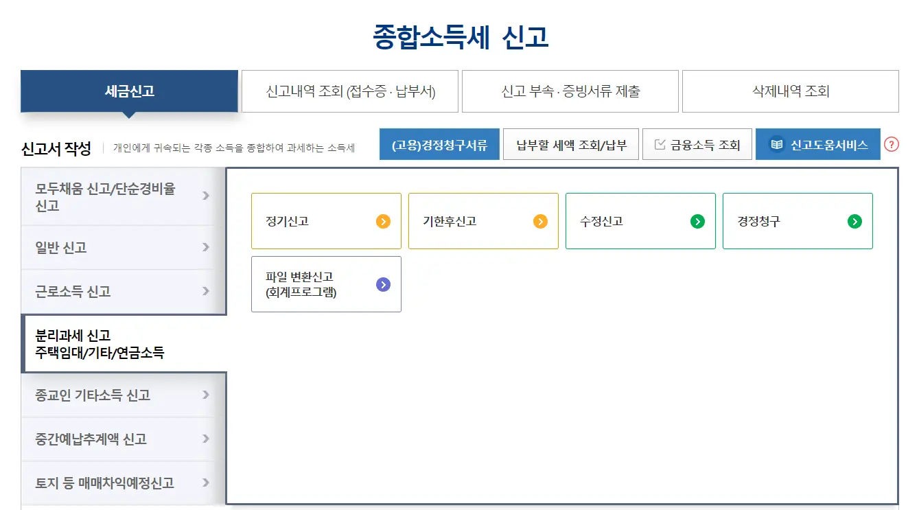 5월 국세청 (홈택스) 를 통해 신고를 하게 되면 4가지 메뉴가 나온다.